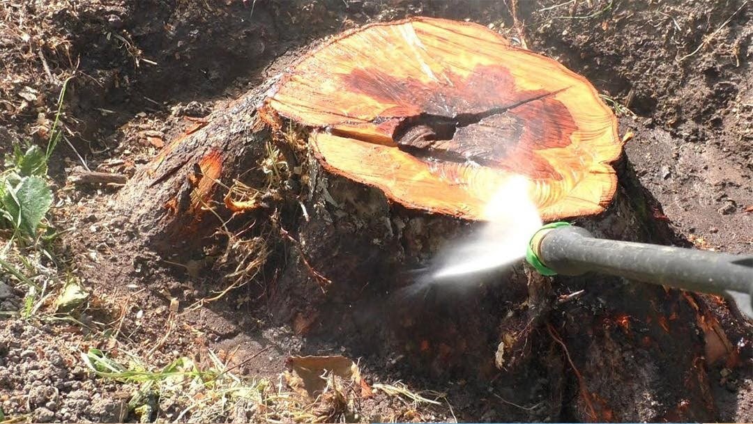 El primer paso es preparar el tocón. Limpia a fondo la superficie utilizando una lavadora a presión o una manguera de jardín con alta presión para eliminar el barro y las piedras. Este paso es crucial para proteger tu equipo y garantizar un corte suave y seguro sin dañar la hoja de la motosierra.